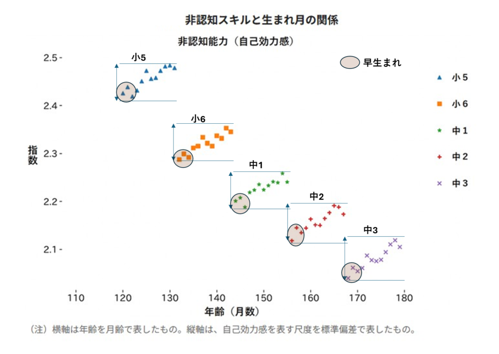 それよりも重要なのは、各学年内では認知スキルと同様に月齢が高いほど非認知スキルのスコアも高いという点です。さらに非認知スキルのほうは学年が上がっても差が縮まらないという傾向がみられます。