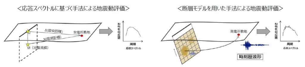 下図は普通の「応答スペクトル法」と今回の対象となった「断層モデル法」を並べたものです。