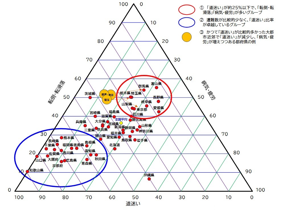 この図では、青丸(遭難数が比較的少ないが、道迷い比率が高い)と赤丸(道迷い比率は低めだが転倒や病気の比率が高め)の2つの分布が見られます。