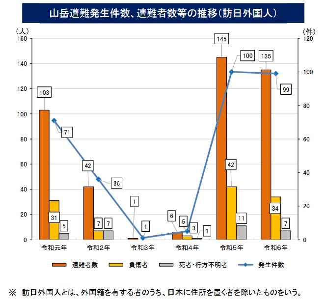国内全体では高齢者の遭難が増え、特定の山では訪日外国人の遭難が目立つというのが現況です。