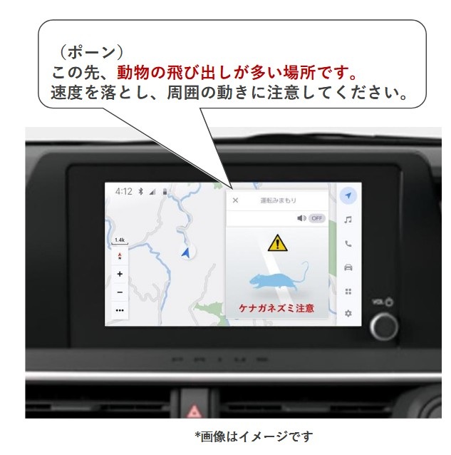 ケナガネズミの警報にとどまらず、山間地でのクマ出現警報、観光地の人ごみ発生警報など、リアルタイムの状況をカーナビから出力することはそれほど難しいことではないでしょう。