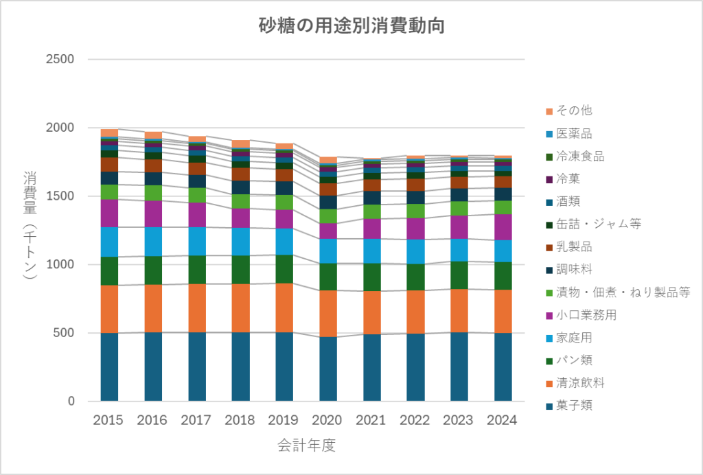国内でどのような用途に砂糖が使用されているかを2015年度から2024年度までの推移図に示します。