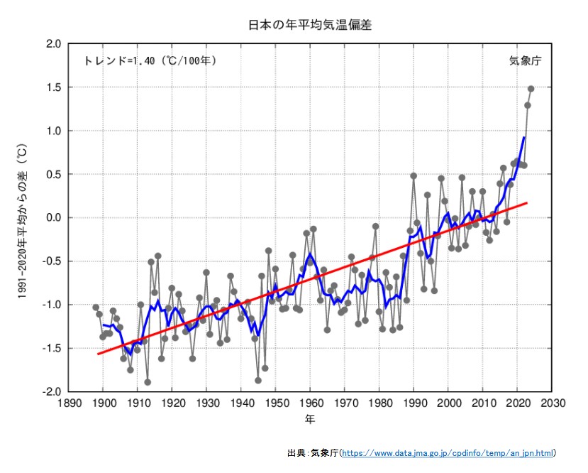 年平均気温偏差は+1.48℃で、明治31年(1898年)の統計開始以降、令和5年(2023年)を上回り最も高い値となった。