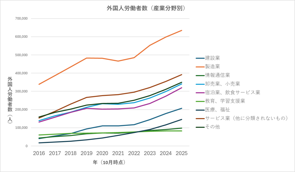 全体としては「製造業」が多いのですが、他の分野も軒並み増加しています。最近、建設業界で外国人労働者が増えたとか、コンビニエンスストアの店員が外国人になったという話を聞きますが、ほぼすべての産業で同じ状況だということがわかります。