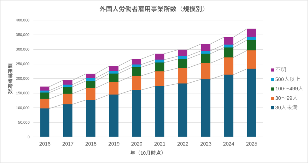 以前より中規模・大規模な事業者は外国人を積極的に雇用していましたが、今や30人未満の小規模事業者が増えています。