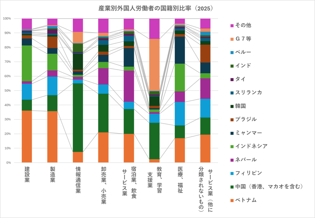 図5は産業分野ごとにどのような国籍の人が働いているかをグラフ化したものです。(以下はすべて2025年10月時点でのデータです。)