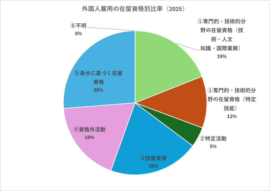 「専門的・技術的分野」の資格と「特定活動」を合わせて3割強、技能実習と資格外活動(アルバイト等)で3割強、「身分に基づく資格」で1/4といった割合です。
